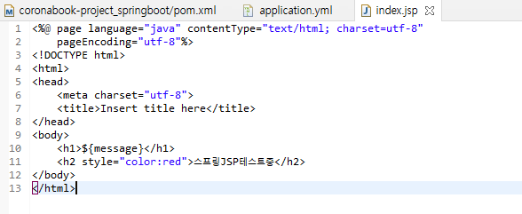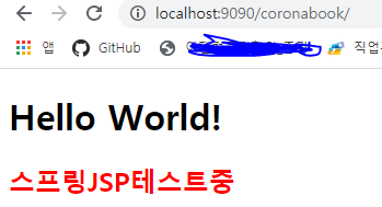 - 서버가 작동한 뒤 브라우저를 열고 http://localhost:9090/coronabook를 주소창에 붙여 넣으면 다음 그림과 같이 Hello World와 테스트문구가 출력되는것을 확인할 수 있습니다.