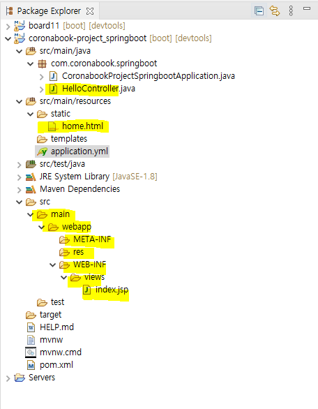 - 다음의 사진에서 노란색으로 하이라이트된 경로에 html파일과 jsp파일을 생성합니다.