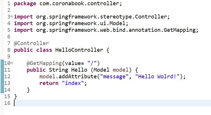 - 다음으로 com.coronabook.controller패키지를 생성한 뒤 HelloController.java파일을 만들어줍니다.