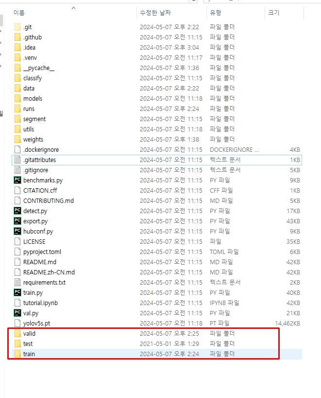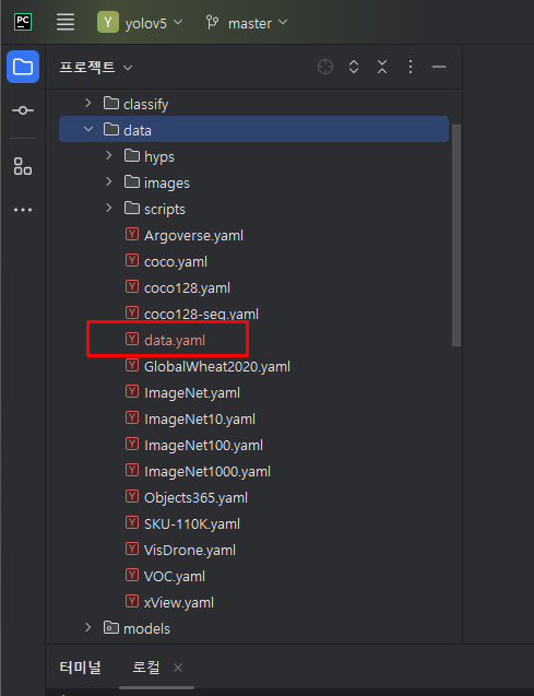 데이터셋 내 yaml 파일은 data 파일안에 넣어줍니다.