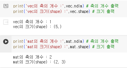 동일하게 타입이 numpy.ndarray라고 나오게 됩니다. Numpy 배열에는 축의 개수(ndim)와 크기(shape)라는 개념이 존재하는데, 배열의 크기를 정확히 숙지하는 것은 딥 러닝에서 매우 중요합니다.