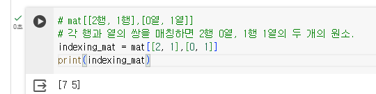 슬라이싱을 사용하면 배열로부터 부분 배열을 추출할 수 있지만, 연속적이지 않은 원소로 배열을 만들 경우에는 슬라이싱으로는 만들 수 없습니다. 예를 들어서 2행 2열의 원소와 5행 5열의 원소를 뽑아서 하나의 배열로 만들고자 하는 경우가 그렇습니다. 이런 경우에는 인덱싱을 사용하여 배열을 구성할 수 있습니다. 인덱싱은 원하는 위치의 원소들을 뽑을 수 있습니다.