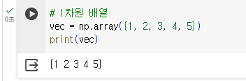 Numpy의 핵심은 ndarray입니다. np.array()는 리스트, 튜플, 배열로 부터 ndarray를 생성합니다. 파이썬 자료구조 중 하나인 리스트를 가지고 1차원 배열을 생성해보겠습니다.