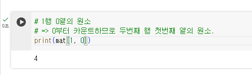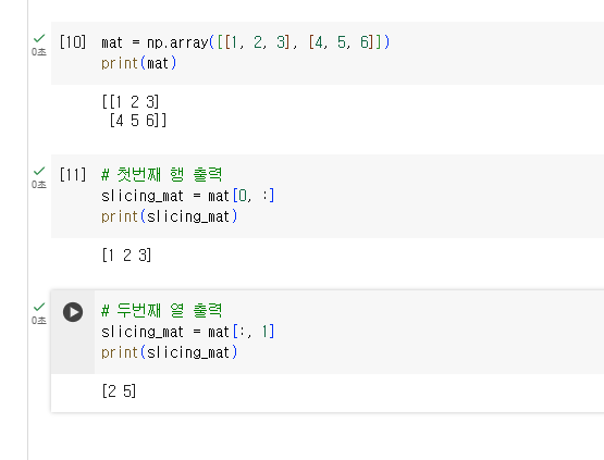 ndarray를 통해 만든 다차원 배열은 파이썬의 자료구조인 리스트처럼 슬라이싱(slicing) 기능을 지원합니다. 슬라이싱 기능을 사용하여 특정 행이나 열들의 원소들을 접근할 수 있습니다.