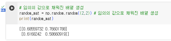 np.random.random()은 임의의 값을 가지는 배열을 생성합니다.