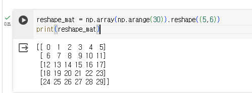 np.reshape()은 내부 데이터는 변경하지 않으면서 배열의 구조를 바꿉니다. 0부터 29까지의 숫자를 생성하는 arange(30)을 수행한 후, 원소의 개수가 30개이므로 5행 6열의 행렬로 변경해봅시다.