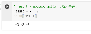 Numpy를 사용하면 배열간 연산을 손쉽게 수행할 수 있습니다. 덧셈, 뺄셈, 곱셈, 나눗셈을 위해서는 연산자 +, -, *, /를 사용할 수 있으며 또는 np.add(), np.subtract(), np.multiply(), np.divide()를 사용할 수도 있습니다.