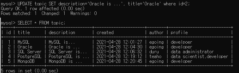 -테이블의 데이터를 수정하기 (where이 없으면 모든 테이블의 데이터가 변경되니까 항상 유의 수정하면 인생이바뀜)