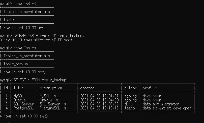 RENAME TABLE [변경될 테이블명] TO [변경하는 테이블명];