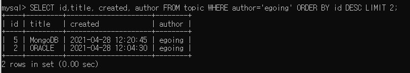 SELECT 컬럼명1, 컬럼명2, 컬럼명3, ... 컬럼명? FROM [테이블명] WHERE [특정컬럼명]='[특정값의데이터]' ORDER BY [내림차순할컬럼명] DESC LIMIT [데이터출력할갯수] ;