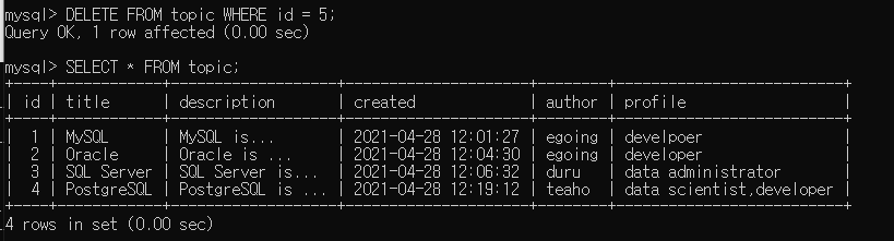 -테이블의 데이터를 삭제하기 (where이 없으면 모든 테이블의 데이터가 삭제되니까 항상 유의 삭제하면 인생이바뀜)