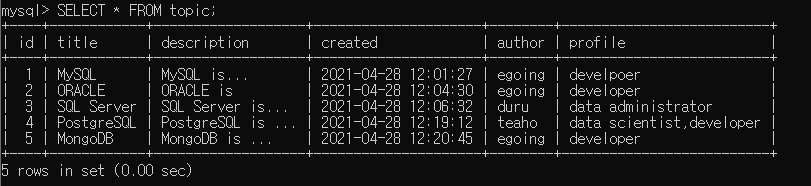 -테이블에 담겨있는 데이터 조회 (