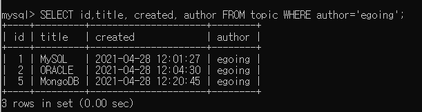 SELECT 컬럼명1, 컬럼명2, 컬럼명3, ... 컬럼명? FROM [테이블명] WHERE [특정컬럼명]='[특정값의데이터]' ;