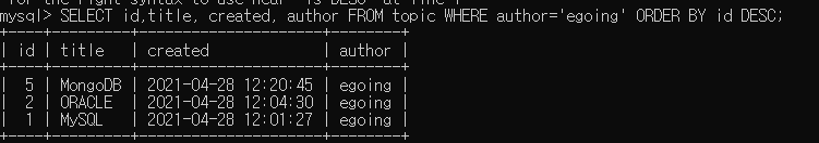 SELECT 컬럼명1, 컬럼명2, 컬럼명3, ... 컬럼명? FROM [테이블명] WHERE [특정컬럼명]='[특정값의데이터]' ORDER BY [내림차순할컬럼명] DESC;