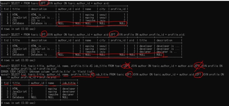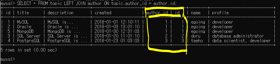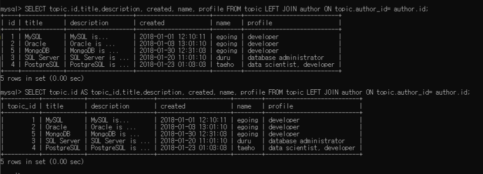 SELECT topic.id AS topic_i, title,description,created,name,profile FROM topic LEFT JOIN author ON topic.author_id=author.id;