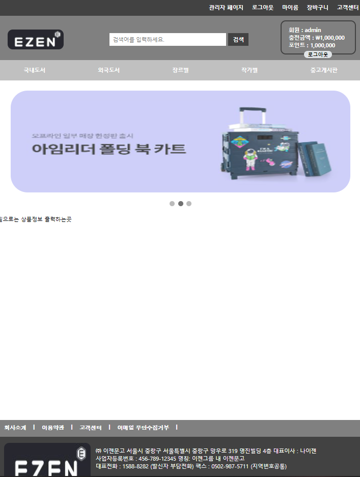 main.jsp / header footer 슬라이드배너 어드민 5가지 기능구현 내 세부 수정 삭제 기능까지 구현완료 / CSS적용 / 페이징 / 검색 기능 html 레이아웃만 짠 뒤 어드민 홈페이지에서 상품등록 완료된 상품을 main > 국내 도서 > 외국 도서 > 장르별 > 작가별 하나하나씩 쿼리따서 데이터 뿌려주고, 장바구니, 구매 기능 넣으면 프로젝트는 완성될 것으로보임. 자유게시판은 손이 많이가므로 제일 후순위로 작업 + main.jsp 컨텐츠영역 틀 추가