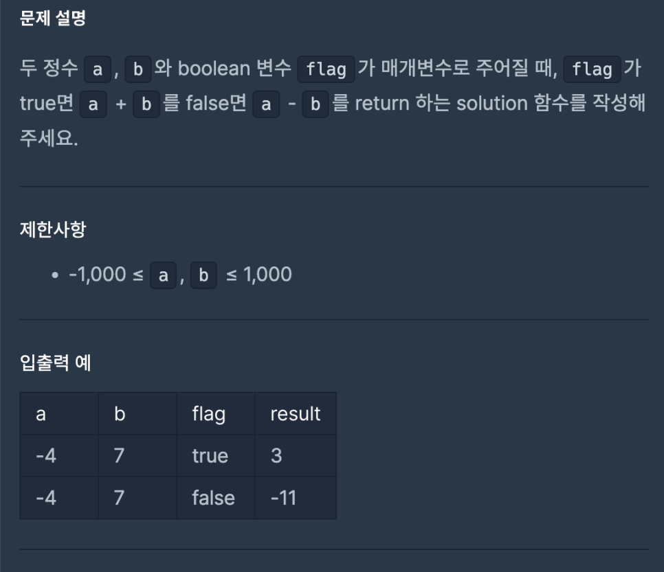 프로그래머스 : flag에 따라 다른 값 반환하기 (파이썬) 요구사항 내답안 def solution(a, b, flag): answer = 0 if(flag): #flag 트루일경우 answer = a + b #두파라메터 더한다 else: # flag 펄스일경우 answer = a - b #두파라메터 뺀다 return answer # 반환한다. 결과 후기 조건만 주면되서 어려운게 하나도 없었다. IT/python 2024.04.16