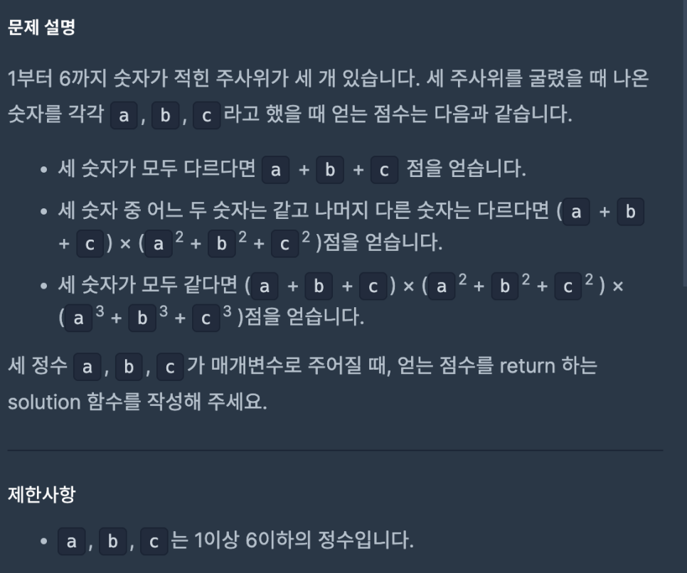 프로그래머스 : 주사위 게임 2 (파이썬) 문제내답안import math #math를 임포트하면 math 관련 함수를 쓸수있음.#math.pow는 제곱의 값을 추출할수 있음.def solution(a, b, c): answer = 0 if a == b and b == c and a == c: #세 숫자가 모두 같다면 answer = (a + b + c) * ((math.pow(a, 2)) + (math.pow(b, 2)) + (math.pow (c, 2))) * ((math.pow(a, 3)) + (math.pow(b, 3)) + (math.pow(c, 3))) elif a == b or b == c or a == c: # 하나라도 같다면 answer = (a + b + c) * ((math.po.. IT/python 2024.04.28