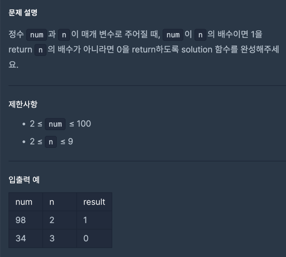프로그래머스 : n의 배수 (파이썬) 문제 내답안 def solution(num, n): answer = 0 #변수 초기화 if(num % n == 0): #num / 2 의 나머지가 0이면 n이 num의 배수임을 확인 할 수 있음. answer = 1 # 배수일떄는 answer값을 1로 변경 elif(num % n ==1): # 나머지가 1일경우에는 배수가 아님을 확인 할 수 있음. answer = 0 # 배수가 아닐때난 answer값을 0로 변경 return answer #최종반환 결과 후기 나머지를 응용한 부분이라 어렵지 않았다. IT/python 2024.04.09