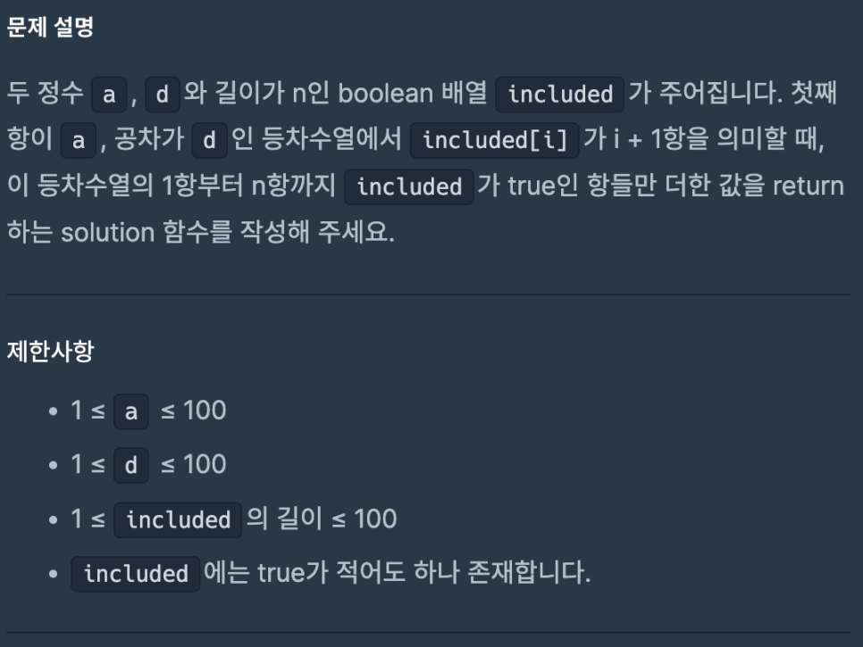 프로그래머스 : 등차수열의 특정한 항만 더하기 (파이썬) 요구사항 내답안 def solution(a, d, included): answer = 0 for i in range(len(included)): #반복문을 돌려 included의 배열갯수만큼 answer += (a + d * i) * int(included[i]) #cincluded[i] 가 int로 1, 0 참 거짓 #으로 구분되는데 0을 곱하게되면 0이 결과가 되므로 합산에 더해지지않음. #print(int(included[i])) 1 0 0 1 1 / 0 0 0 1 0 0 0 return answer 결과 후기 딱 문제해결을 하려할때 생각을 많이하게 되었고, print를 찍으면서 처리하니 은근 쉬웠던 문제였다. IT/python 2024.04.22