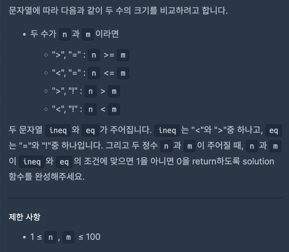 프로그래머스 : 조건 문자열 (파이썬) 요구사항 답안 def solution(ineq, eq, n, m): answer = 0 if(ineq == ""): #1차분기처리 if(eq == "="): #2차분기처리 answer = int(n>=m) #2차 분기가 이퀄이면 같거나 크거나 조건으로 처리 elif(eq == "!"): answer = int(n>m) return answer 결과 후기 eval 이란 내장함수를 사용해서 3항연산자로 처리하는것이 좋은것같으나, 구글링을 하여 처리하면 문제해결능력에 좋지않은것같아 1차원적으로 해결했고, 처리완료 구글링하여 이런 답안도 있다라고 참고하였음. IT/python 2024.04.15