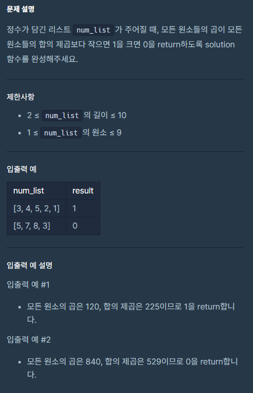 프로그래머스 : 원소들의 곱과 합 (파이썬) import math #math를 임포트하면 math 관련 함수를 쓸수있음.def solution(num_list): answer = 0 #초기화 res1 = 1 #초기화 res2 = 0 #초기화 for i in range(len(num_list)) : #반복시작 num_list배열의 길이만큼 res1 *= num_list[i] # 값누적(곱) res2 += num_list[i] # 값누적 (덧) res2 = (math.pow(res2, 2)) # res2 최종 제곱값 if(res1 문제내답안 결과후기기존에서의 활용버전이라 크게 어려움은 없었다. IT/python 2024.04.29