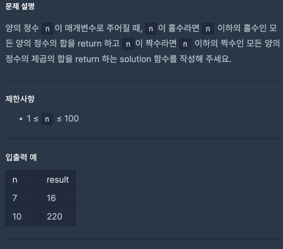 프로그래머스 : 홀짝에 따라 다른 값 반환하기 (파이썬) 요구사항 답안 def solution(n): answer=0 #결과값 초기화 if(n % 2 == 0): #n이 짝수면 for i in range(1,n+1): #1부터 n의 숫자까지 반복돌린다. if(i % 2 == 0): # 반복문의 1부터 ~ n까지 유효성검증 (짝수인지) #print(i) i2 = i * i #짝수가 맞으면 제곱의값을 추출함 answer = answer + i2 #결과값에 합을 누적 elif(n % 2 == 1): #n이 홀수면 for i in range(1,n+1): # 1부터 n의 숫자까지 반복돌린다. if(i % 2 != 0): # 반복문 1부터 ~ n까지 유효성검증 (홀수인지) #print(i) answer = answer + i # 홀수가 맞으면 홀수의 값들을 누적시킴.. IT/python 2024.04.12