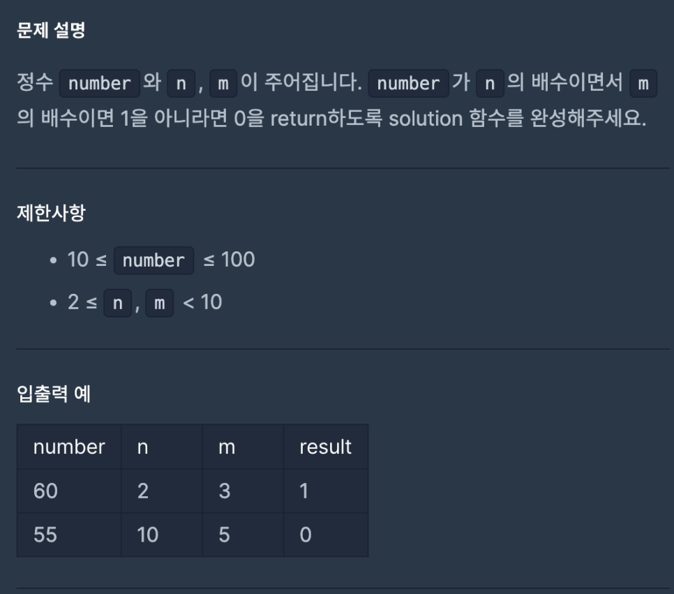 프로그래머스 : 공배수 (파이썬) 문제 내답안 def solution(number, n, m): answer=0; #변수 0 초기화 if( (number % n) == 0 and (number % m) == 0): #number가 n과 m의 공배수이면 answer = 1; #변수 1로 변경 return answer; #리턴 결과 후기 나머지를 응용한 부분이라 어렵지 않았다. IT/python 2024.04.10