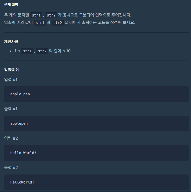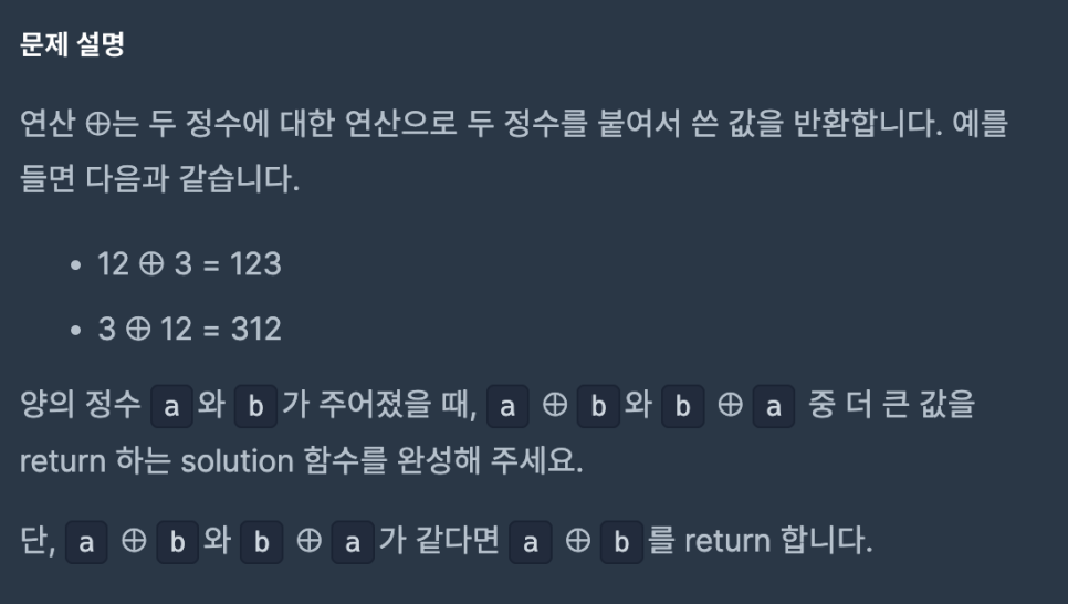 문제 내답안 def solution(a, b): _2xaxb = 2 * a * b # 2*a*b 값저장 a = str (a) #받은 파라미터 문자열 형변환 b = str (b) #받은 파라미터 문자열 형변환 str_ab = a+b #받은 파라미터 문자열 붙임 int_ab = int(str_ab) #문자열붙인 문자를 정수로 형변환 if(int_ab > _2xaxb or int_ab == _2xaxb) : #비교문 ab가 크거나 값이 같으면 return int_ab elif(int_ab